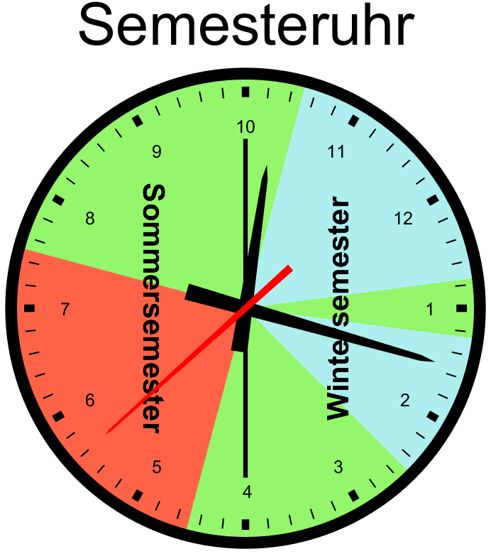 Diese Website liefert nun die passende Uhr dazu. Sie unterteilt die 12 Stunden eines Ziffernblatts in zwei Hälften: links das Sommersemester, rechts das Wintersemester. Die Stunden entsprechen den Monaten, wobei zwei Minuten immer etwa ein Tag sind. Zur besseren Übersicht (für die Studenten) sind die Vorlesungs- und vorlesungsfreie Zeiten farblich markiert.